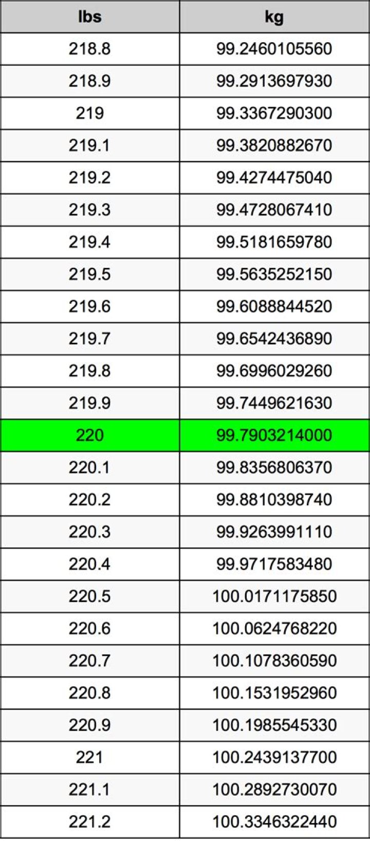 220 pounds is approximately 99.79 kilograms.